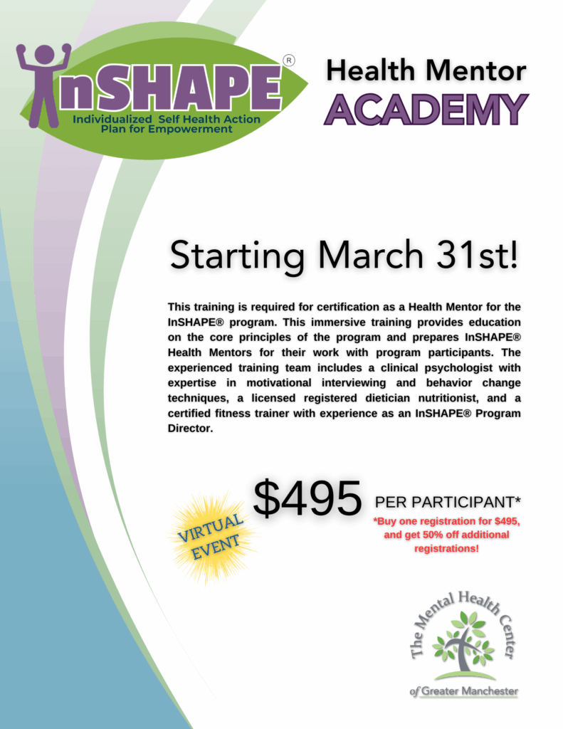 Bring InSHAPE® to your agency and become a Certified InSHAPE® Health Mentor! InSHAPE® is the most researched, evidence-based health promotion program for individuals living with serious mental illness. This multi-component training includes CEs through both the ANCC and NASW for license behavioral health clinicians and nurses! Register one learner at full price and all subsequent learners get 50% off tuition price! Contact Pete Costa for details at costapet@mhcgm.org.