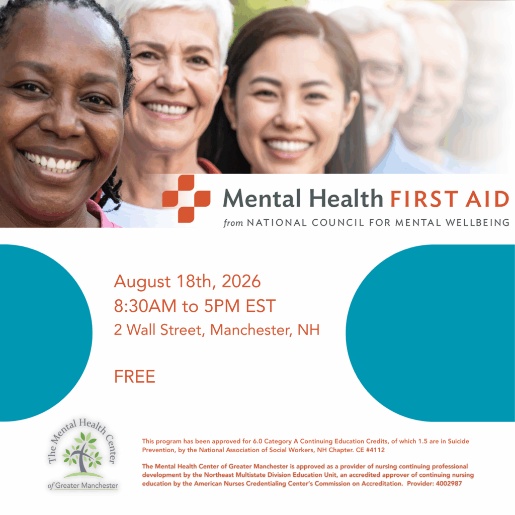 Become a Certified Mental Health First Aider and discover what more than 4 million individuals worldwide already know about responding to someone struggling!  Mental Health First Aid provides an easy to remember framework for helping someone struggling with a mental health or substance misuse issue.  This course provides 6.0 Category A Continuing Education Credits, 1.5 of which in Suicide Prevention, by the National Association of Social Workers, NH Chapter.  CE# 4112.  This course provides 6 contact hours for nurses through the ANCC.  This course is FREE and no pre-work is required!